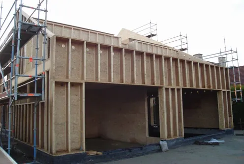 Деревянные двутавровые балки перекрытий, наружные стеновые стойки, внутренние перегородки, стропильная система, кронштейны.