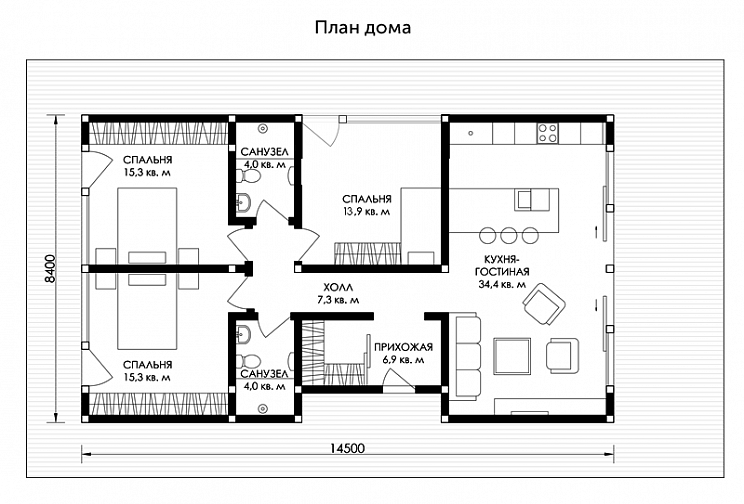 Одноэтажный загородный дом в стиле Фахверк станет уютным домом для Ваших гостей или прекрасным компактным решением для постоянного проживания. При разработке проекта мы предусмотрели установку финской сауны. Все в этом проекте говорит о счастливой загородной жизни вашей семьи и гостей. Терраса вокруг дома отлично подходит для прекрасного отдыха на лоне природы.